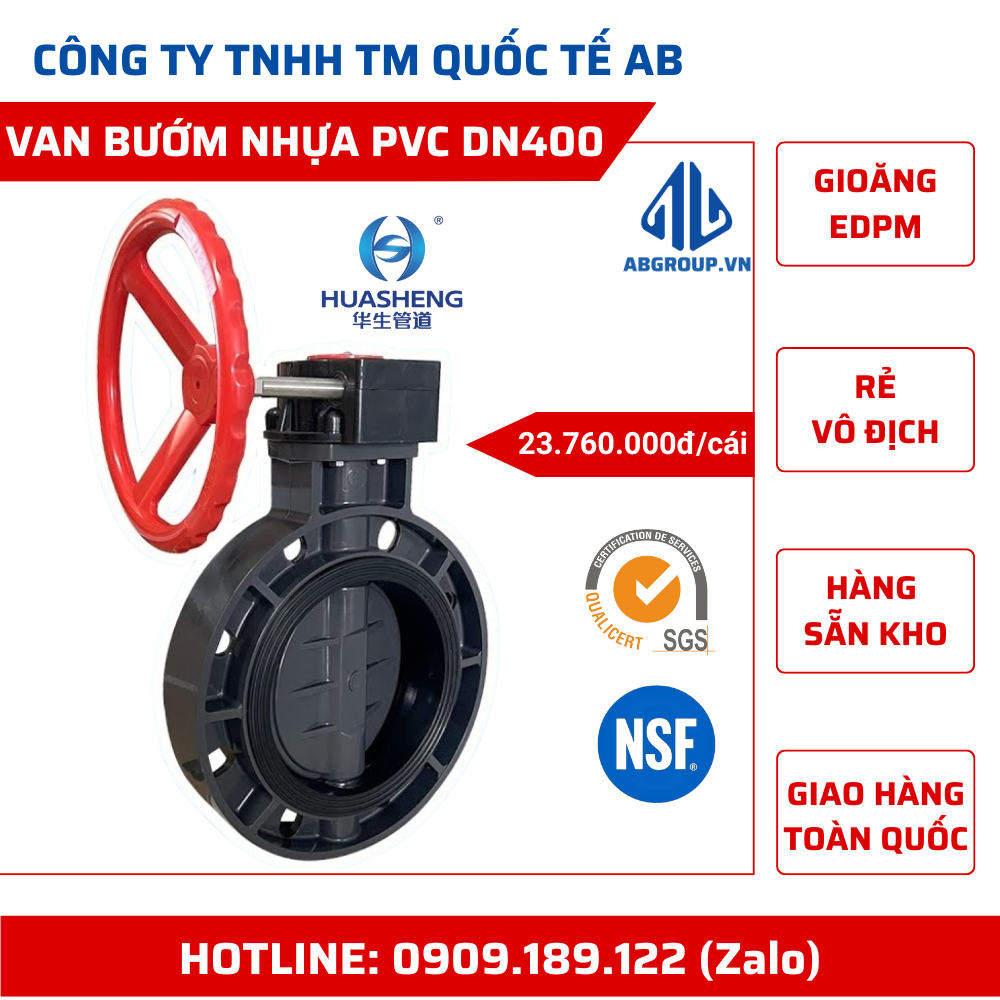 Giá niêm yết sản phẩm van bướm nhựa uPVC DN400 tay quay và các đường kính khác. Đơn giá bán chính xác được báo theo số lượng cụ thể, quý khách hàng vui lòng liên hệ 0909189122 (zalo) để có thể mua hàng giá rẻ nhất.